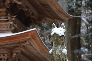 大寒の翌日、夜中に駒ヶ根も雪が降りました。光前寺に行ってみると、早太郎さんの顔に雪がつもって顔パックのようになっていました。早太郎さんも楽しんでいるのかもしれません。(駒ケ根市 光前寺)2026.1.22